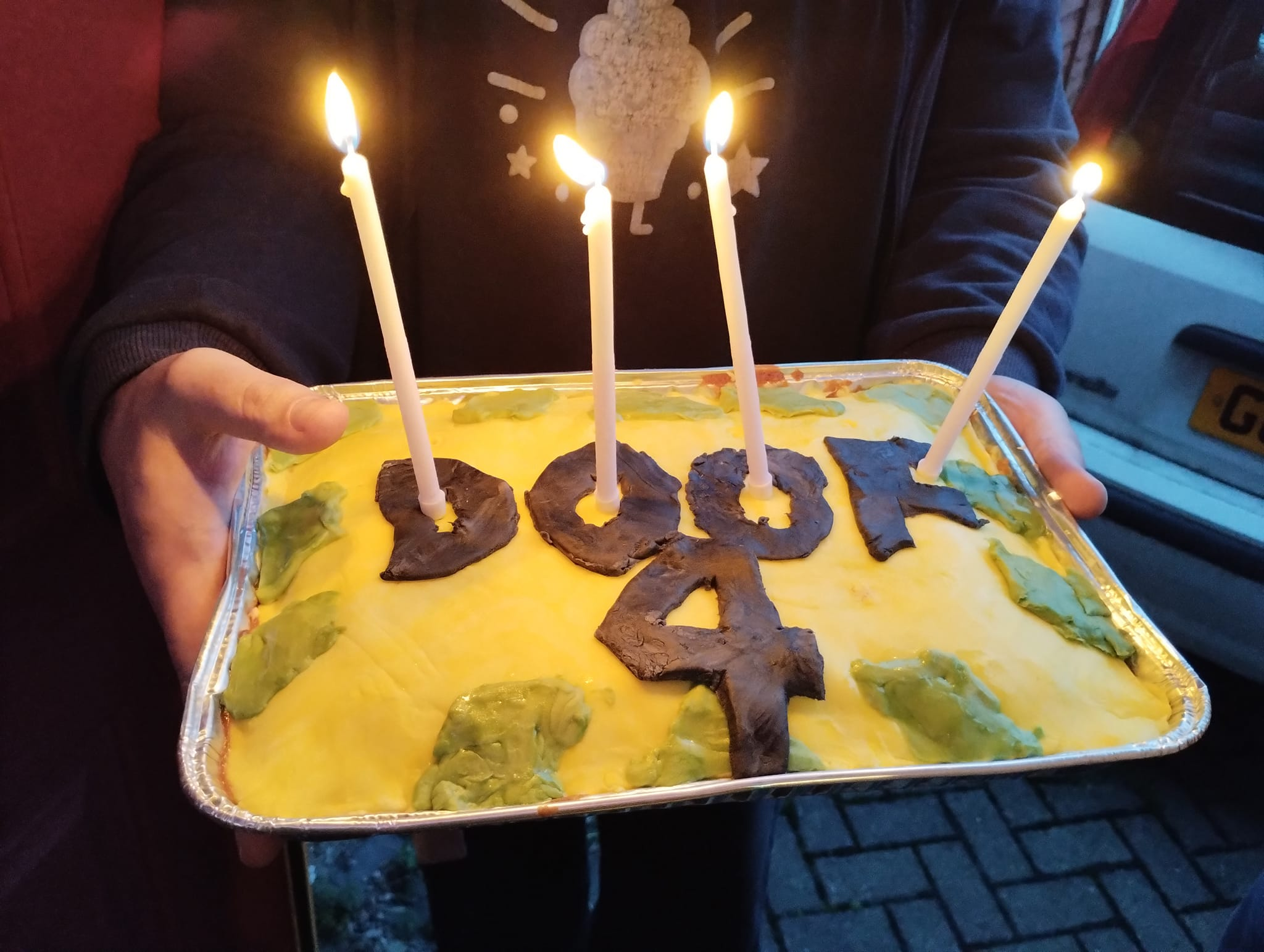 cosmolinguist into helping me make a Birthdoof Cake. It was a simple sponge cake, with a layer of yellow-dyed fondant and green fondant edge chevrons to match the Doof logo. E cut the letters "DOOF 4" out of black fondant and we arranged them on top, along with four glittery candles. We did the baking last night and dyed the icing, then today we rolled it all out and arranged it. One of the Doof DJs lives in south Manchester, and we delivered it to her about 40 minutes before she went onstage. She graciously gave us a couple of slices to take home with us so we could taste the fruits of our labour.