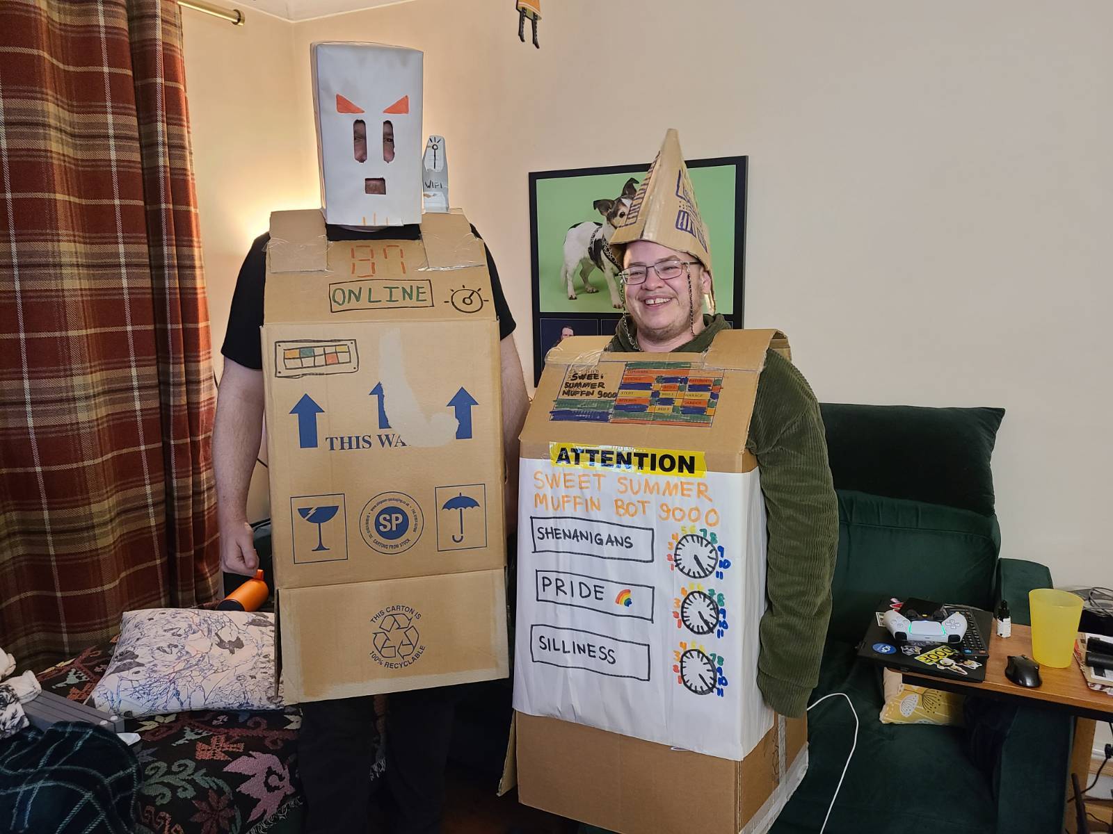 So I thought about doing something deliberately low-key and mediocre - getting one of the boxes out of the loft from when we moved house, and making a robot costume out of it. This is a proper five year old kid level of costume, so I picked up some cheap poster paints from B&M for decoration. I happened to crack open a large cardboard box full of Diet Coke cans, which I could repurpose as a helmet. As it happens, work was too busy (or rather, I slacked too much earlier in the week) to even decorate as minimally as I had planned and I ended up largely scribbling with a few markers. Also, I got down two boxes in case I messed one up, and [personal profile] cosmolinguist claimed the other for his own robot outfit. He put more effort into decoration than me, as I was focussed on putting enough sellotape on the cardboard shoulder "straps" to make sure the outfits didn't collapse around us.